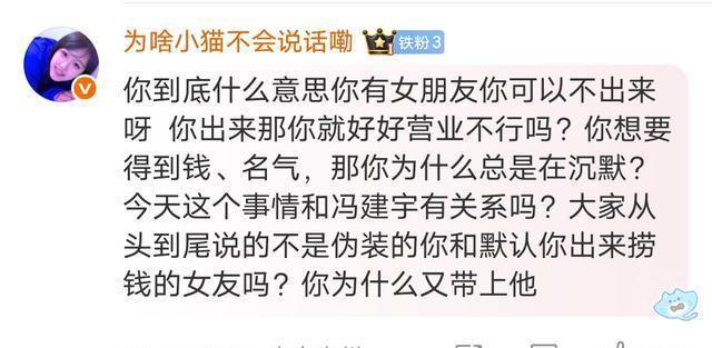 你到底什么意思,你有女朋友你可以不出来呀,你出来那你就好好营业不行吗?你想要得到钱、名气,那你为什么总是在沉默?今天这个事情和冯建宇有关系吗?大家从头到尾说的不是伪装的你和默认你出来捞钱的女友吗?你为什么又带上他?
