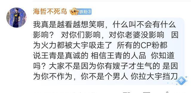 我真是越看越想笑啊,什么叫不会有什么影响?对你们影响,对你老婆没影响,因为火力都被大宇吸走了,,所有的CP粉都说王青是真诚的相信王青的人品,你知道吗?大家不是因为你有嫂子才生气的,是因为你不作为,你不是个男人,你拉大宇挡刀。