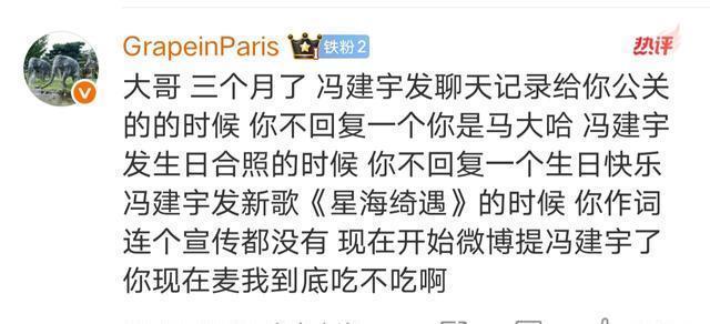 大哥,三个月了,冯建宇发聊天记录给你公关的的时候,你不回复一个,你是马大哈。 冯建宇发生日合照的时候,你不回复一个生日快乐,冯建宇发新歌《星海绮遇》的时候,你作词连个宣传都没有,现在开始微博提冯建宇了。