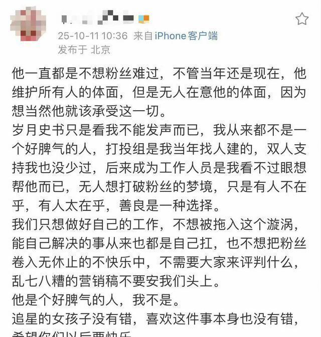 10月11日,冯建宇经纪人也下场了,发长文回应: 他一直都是不想粉丝难过,不管当年还是现在,他维护所有人的体面,但是无人在意他的体面,因为想当然他就该承受这一切。 岁月史书只是看我不能发声而已,我从来都不是一个好脾气的人,打投组是我当年找人建的,双人支持我也没少过,后来成为工作人员是我看不过眼想帮他而已,无人想打破粉丝的梦境,只是有人不在乎,有人太在乎,善良是一种选择。 我们只想做好自己的工作,不想被拖入这个漩涡,能自己解决的事从来也都是自己扛,也不想把粉丝卷入无休止的不快乐中,不需要大家来评判什么,乱七八糟的营销稿不要安我们头上。 他是个好脾气的人,我不是。追星的女孩子没有错,喜欢这件事本身也没有错,希望你们以后要快乐。