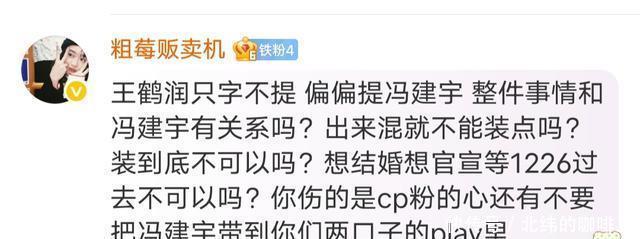 王鹤润只字不提,偏偏提冯建宇,整件事情和冯建宇有关系吗?出来混就不能装点吗?装到底不可以吗?想结婚想官宣等1226过去不可以吗?你伤的是cp粉的心,还有不要把冯建宇带到你们两口子的play里。