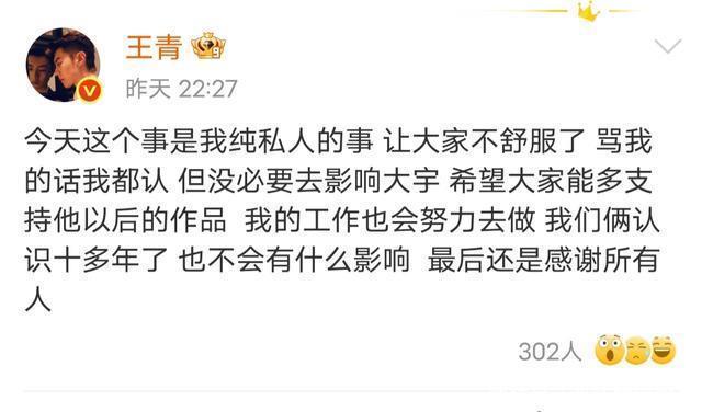 今天这个事是我纯私人的事,让大家不舒服了,骂我的话我都认,但没必要去影响大宇。 希望大家能多支持他以后的作品,我的工作也会努力去做,我们俩认识十多年了,也不会有什么影响,最后还是感谢所有人。