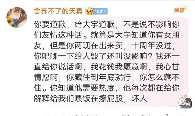 你要道歉,给大宇道歉,不是说不影响你们友情这种话。 就算是大宇知道你有女朋友,但是你俩现在出来卖,十周年没过,你吧唧一下给人毁了还叫没影响?我还一直给你说话啊,我花钱我愿意啊,我心甘情愿啊,你藏住到年底就行,你怎么藏不住。你知道他需要热度,他每次都在给你解释给我们喂饭在擦屁股,坏人。